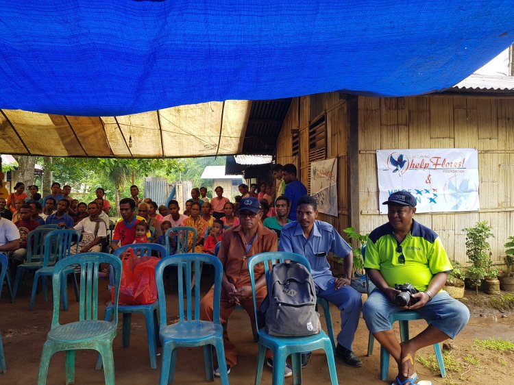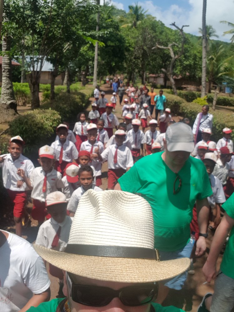Vanmorgen zijn we op tijd vertrokken voor de laatste en belangrijkste dag van ons werkbezoek. Het doel van de reis was vandaag het dorp Kajowain. Daar gingen we vertellen over Schoolboeken, een nieuw Consultatiebureau, en 105 nieuwe toiletten. We vertrokken per auto, en vervolgens drie kwartier per brommer tegen de berg op.